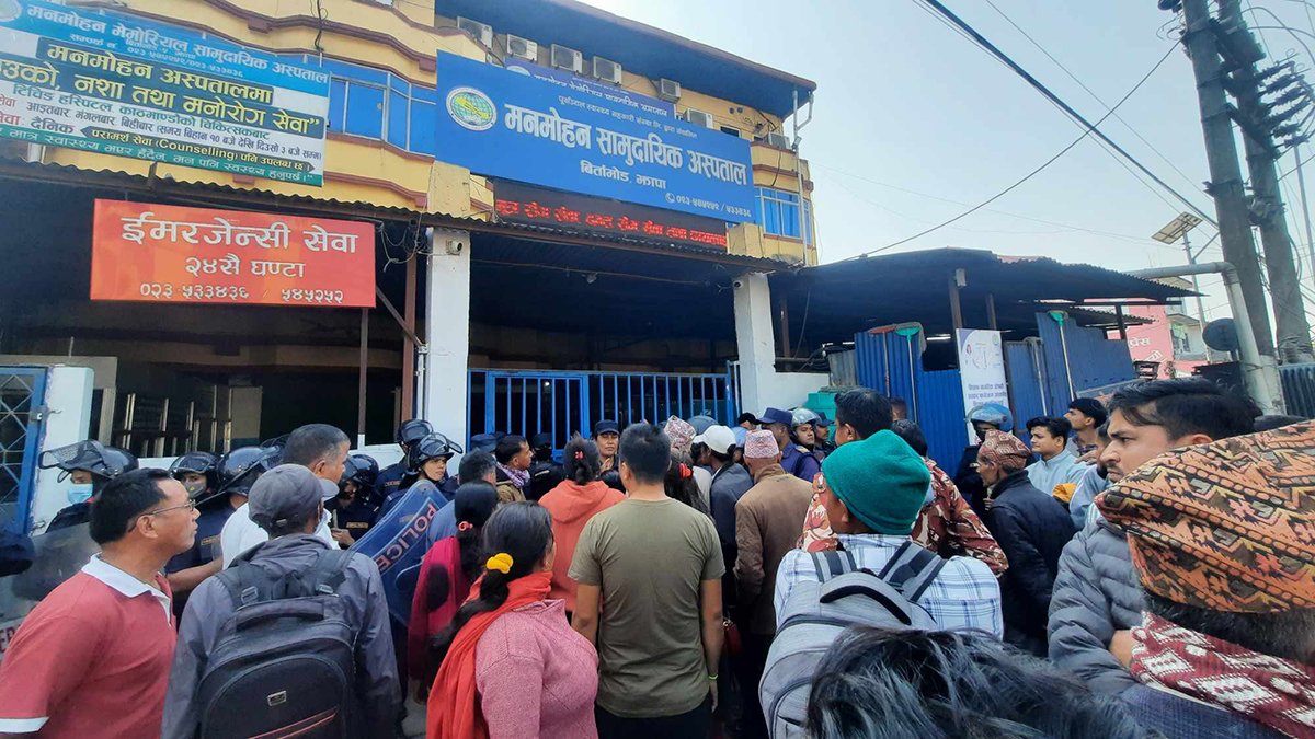 झापा, १० पौष । झापाको बिर्तामोडस्थित मनमोहन मेमोरियल सामुदायिक अस्पताल परिसर तनावग्रस्त बनेको छ । उपचाररत एक महिला बिरामीको मृत्यु भएपछि बिरामी पक्षका आफन्तहरूले सोमबार साँझदेखि नै अस्पताल परिसर घेराउ गर्दै नाराबाजी गरिरहेका छन् ।