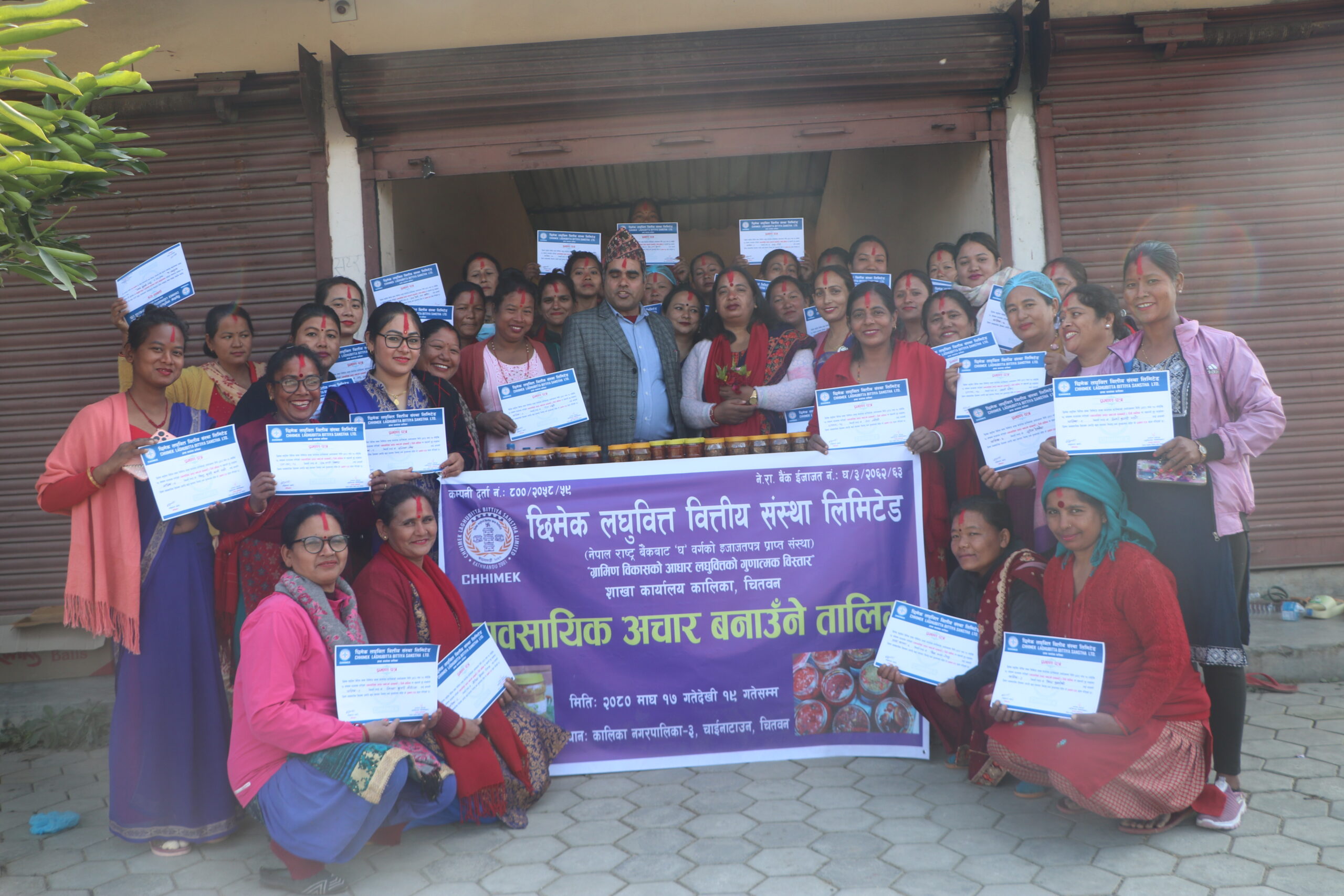 कालिका, १९ माघ । छिमेक लघुवित्त वित्तीय संस्थाले आयोजना गरेको व्यवसायिक अचार बनाउँने तालिम शुक्रवार सकिएको छ । आफ्ना इकाई समुहका ४१ जना महिलाहरुलाई व्यवसायिक अचार बनाउँने तालिम दिएको हो ।