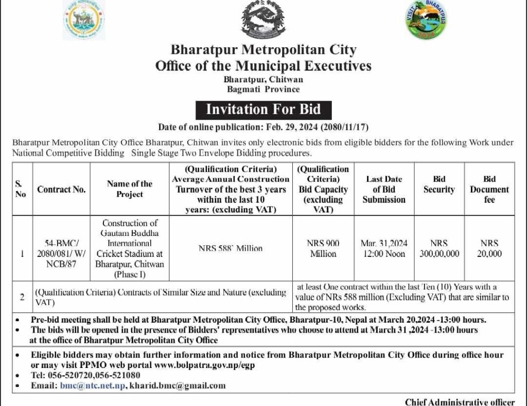 महानगरपालिकाले बिहिबार सार्वजनिक सूचना जारी गरेर इच्छुक र योग्य कम्पनीलाई एक महिनाभित्र आवेदन पेश गर्न आह्वान गरेको हो । भरतपुर महानगरपालिकाका वरिष्ठ ईन्जिनियर सन्तोष आचार्यका अनुसार टेण्डरको प्रस्ताव ३१ औं दिनमा खोलिनेछ र त्यसको करिब दुई हप्तामा प्राप्त प्रस्तावहरुको मूल्यांकन गरी छनोट भएको कम्पनीलाई निर्माणको जिम्मा दिइनेछ । रंगशाला प्रकृतिको काम गरेको निर्माण कम्पनीलाई प्राथामिकता दिइने महानगरपालिकाका वरिष्ठ ईन्जिनियर आचार्यले जानकारी दिनुभयो । टेण्डर सम्बन्धी गुनासो भए २० दिनभित्र महानगरपालिकामा सम्पर्क गर्न प्रकाशित सूचनामा भनिएको छ ।