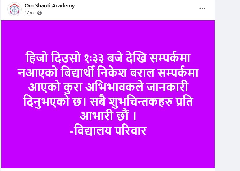 चितवन, २० फागुन । चितवनको भरतपुर स्थित ओम शान्ति एकाडेमी विद्यालयवाट घर फर्किने क्रममा बेपत्ता भएका १३ वर्षीय बालक निकेश बराल हेटौंडामा भेटिएका छन् । विद्यालयले पनि फेसबुक मार्फत बालक सम्र्पकमा आएको जानकारी दिएको छ ।
