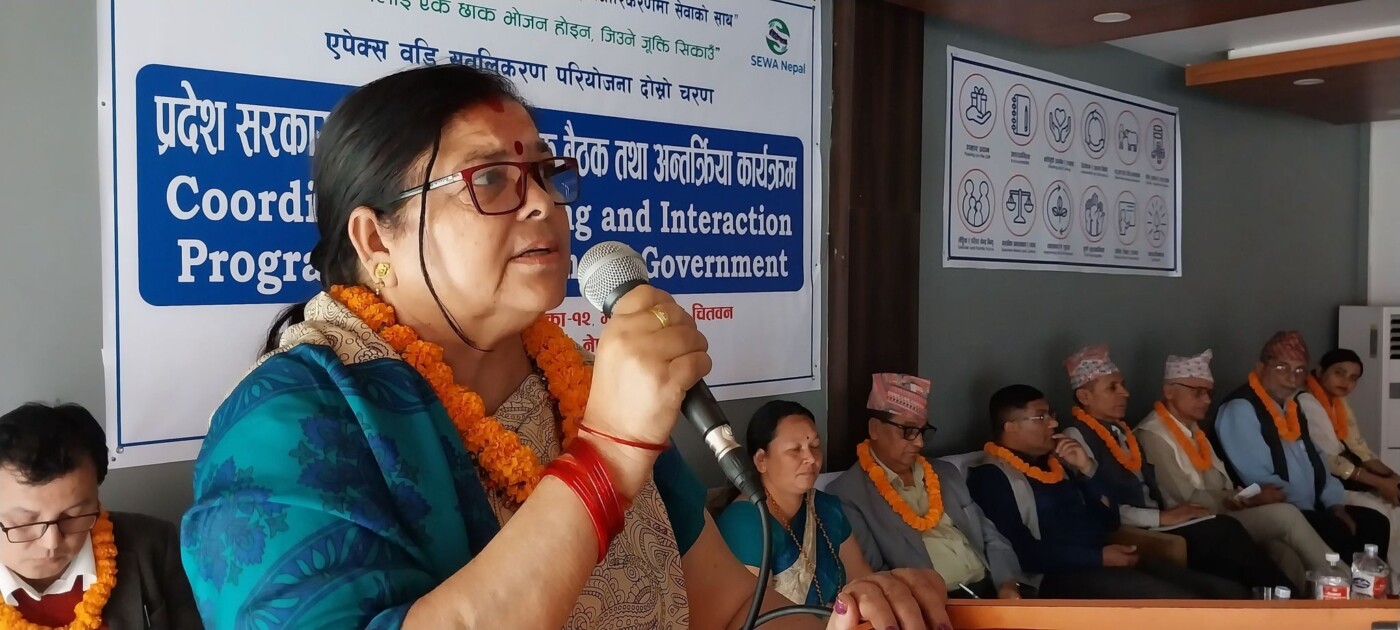 सेवा नेपालकी अध्यक्ष पार्वती न्यौपानेको अध्यक्षतामा भएको कार्यक्रममा बागमती प्रदेशकी सांसद मायादेवी शर्मा, महिला समुह समन्वय समितिकी अध्यक्ष इन्दिरा पौडेल, बहुउद्देश्यीय सहकारी संघका अध्यक्ष भीष्मराज खनाल, उद्योग तथा बाणिज्य कार्यालय भरतपुरकी प्रतिनिधि कृष्णा श्रेष्ठ, मोक्षलय बहुउद्देयीय प्रा.लि.का मनिष पौडेल लगायतले मन्तव्य राखेका थिए । सेवा नेपालकी सचिव कल्पना रिमालले सञ्चालन गरेको सो कार्यक्रममा प्रदेश समिति संयोजक शैलजा घिमिरेले स्वागत मन्तव्य राखेकी थिइन् ।—00—