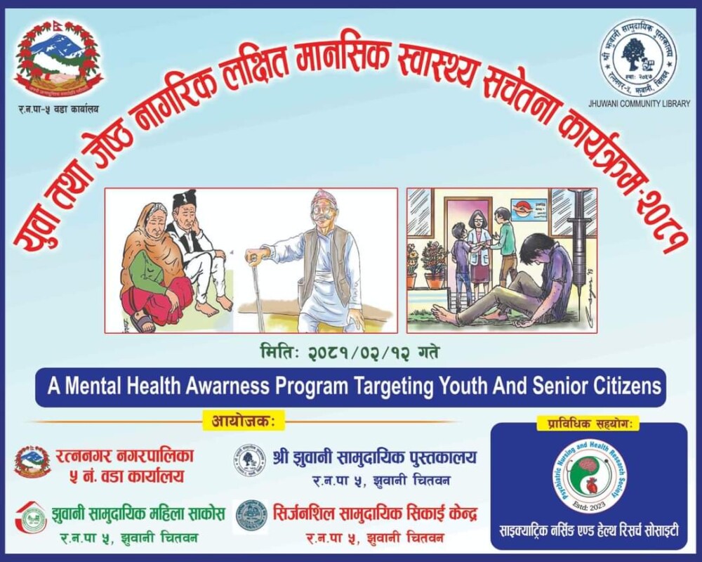 झुवानी सामदायिक पस्तकालय, झुवानी सामदायिक महिला साकोस, सिर्जनशिल सिकाई केन्द्र र रत्ननगर नगरपालिका वडा नं. ५ को संयक्त आयोजना तथा साइक्याट्रिक नर्सिङ हेल्थ रिसर्च सोसाईटी भरतपरको प्राविधिक सहयोगमा कार्यक्रम सम्पन्न भएको हो ।