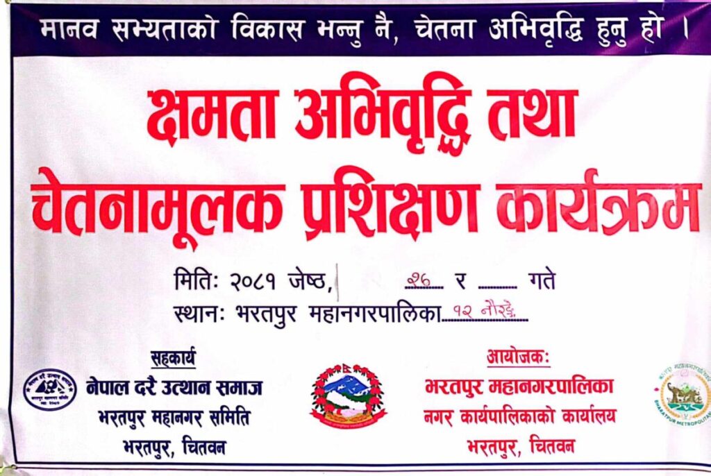 भरतपुर , २७ जेठ । भरतपुर महानगरपालिकाको आयोजना तथा नेपाल दरै उत्थान समाज भरतपुर महानगर समितिको सहकार्यमा आइतबार भरतपुरमा दुई दिने क्षमता अभिबृद्वी तथा चेतनामूलक प्रशिक्षण कार्यक्रम शुरु भएको छ ।