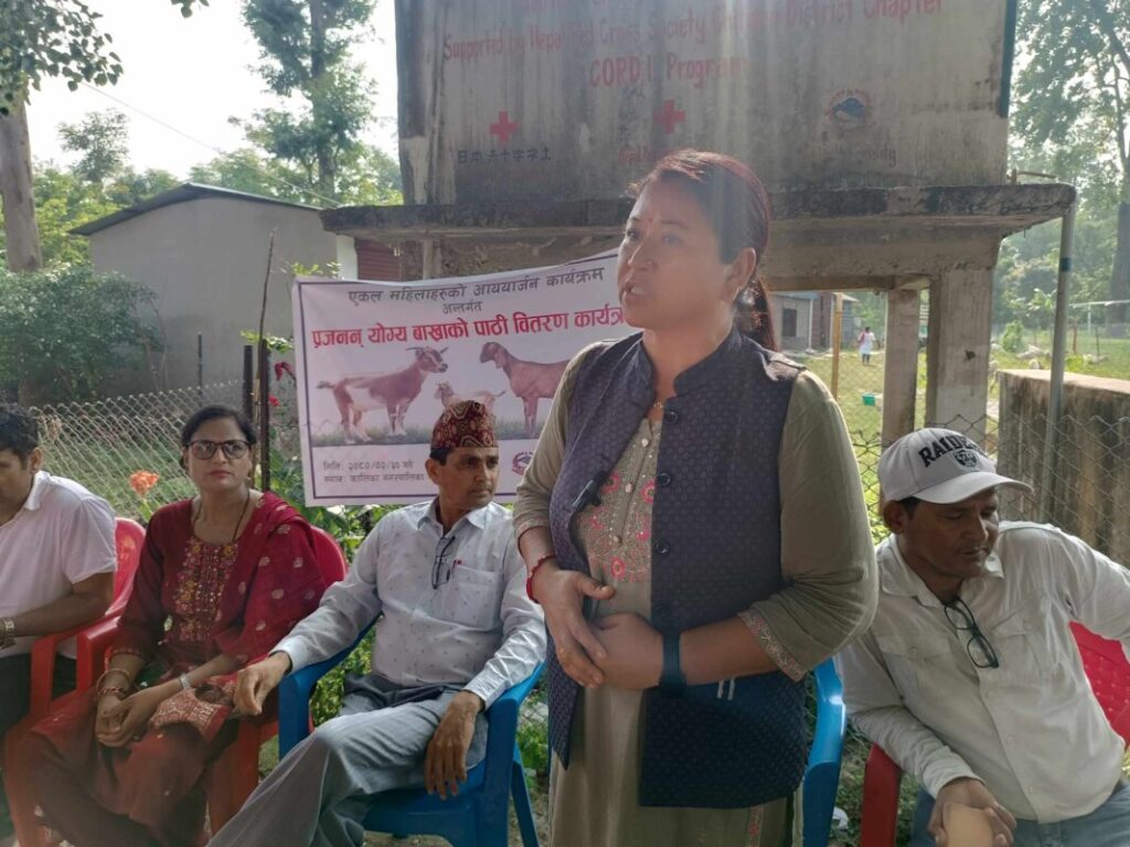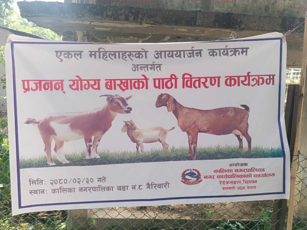 प्रत्येक वडाका पाँच पाँचजना एकल महिलाहरुलाई प्रजनन् योग्य बाख्राको पाठी वितरण गरिएको हो । कालिका नगरपालिका वडा नं. ८ गैरिबारी स्थित लगनशील सामाजिक उद्यमी महिला सहकारी संस्थाको परिसरमा एक कार्यक्रमको आयोजना गरी बाखा्र वितरण गरिएको हो ।