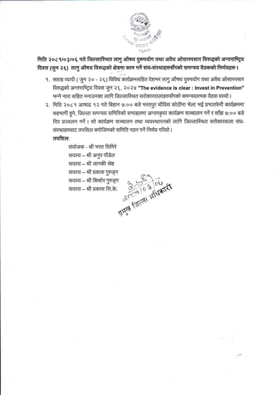 लागु औषध दुरुपयोग तथा अवैध ओसारपसार विरुद्धको अन्तराष्ट्रिय दिवस जुन २६, २०२४ “The evidence is clear: Invest in Prevention” भन्ने नारा सहित बिहान ७:०० बजे भरतपुर चौविस कोठीमा भेला भई प्रभातफेरी कार्यक्रममा सहभागी हुने निर्णय गरिएकाे जिल्ला प्रशासन कार्यालय चितवनले जनाएको छ ।