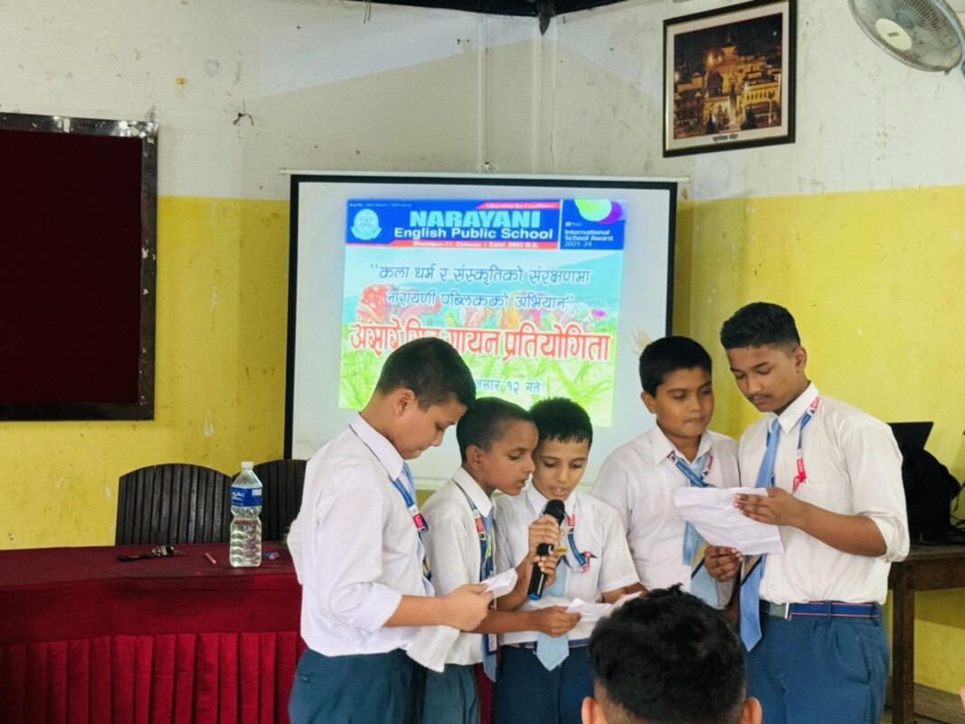 नारायगढ, १२ असार । “कला धर्म र संस्कृतीको संरक्षणमा नारायणी पब्लिकको अभियान” भन्ने नारालाई आत्मसाथ गर्दै भरतपुर ११ स्थित नारायणी ईङ्गलिस पब्लिक स्कुलमा असारे गित गायन प्रतियोगिता सम्पन्न भएको छ ।