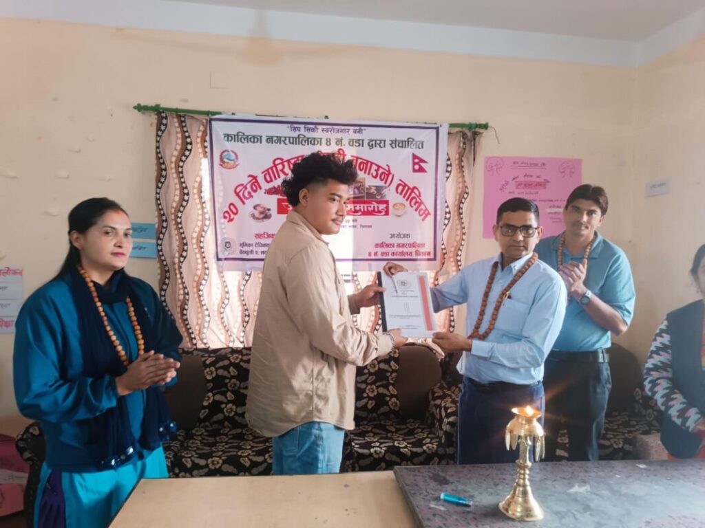 कालिका नगर प्रमुख विनोद रेग्मीले आज विहान तालिमको उद्घाटनगर्नुभयो । तालिम उद्घाटन कार्यक्रममा बोल्दै नगर प्रमुख रेग्मीले सीप विकास नभए सम्म आर्थिक सम्बृद्धि हुन नसक्ने बताउनुभयो । नगरपालिकाले सीप मूलक तालिमलाई प्राथमिकता दिँदै आएको बताउनुभयो । कार्यक्रमका प्रमुख अतिथि समेत रहनुभएका नगर प्रमुख रेग्मीले तालिमवाट व्यवसायिक रुपमै कफी सप संचालनगर्न सकिने बताउनुभयो । सीप सिकेर स्थानीय क्षेत्रमै केही गरौं भन्ने युवाहरुलाई केही सिटमनीको समेत व्यवस्थापन नगरपालिकाले गर्दै आएको उहाँले जानकारी दिनुभयो ।