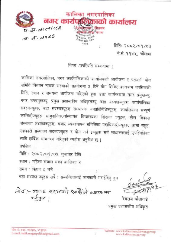 कालिका, ३ वैशाख । पतञ्जली योग समितिको सहकार्यमा कालिका नगरपालिकाले पाँच दिने योग शिविर आयोजनागर्ने भएको छ।