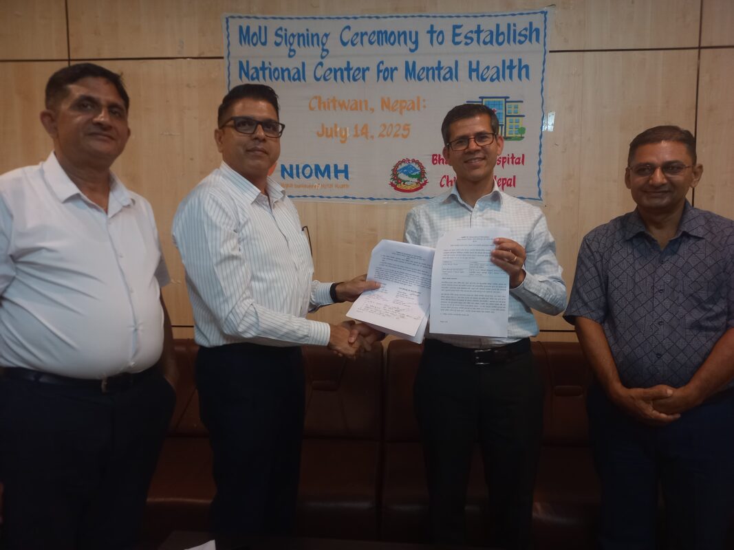 सम्झौतापत्रमा हस्ताक्षर गर्दै नेपाल इन्स्टिच्युट अफ मेन्टल हेल्थका कार्यकारी निर्देशक श्रीधर पौडेलले नेपालमा मानसिक स्वास्थ्यलाई प्राथमिकता दिनुपर्ने महसुसका साथ यो पहल गरिएको बताउनुभयो।