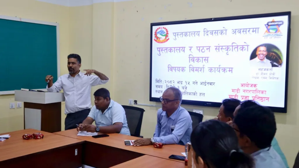 चितवन,१५ भाद्र – पुस्तकालय दिवसको अवसरमा आज आइतबार माडी नगरपालिकाको सभा हलमा ‘पुस्तकालय र पठन संस्कृतिको विकास’ विषयक विमर्श कार्यक्रम सम्पन्न भएको छ।