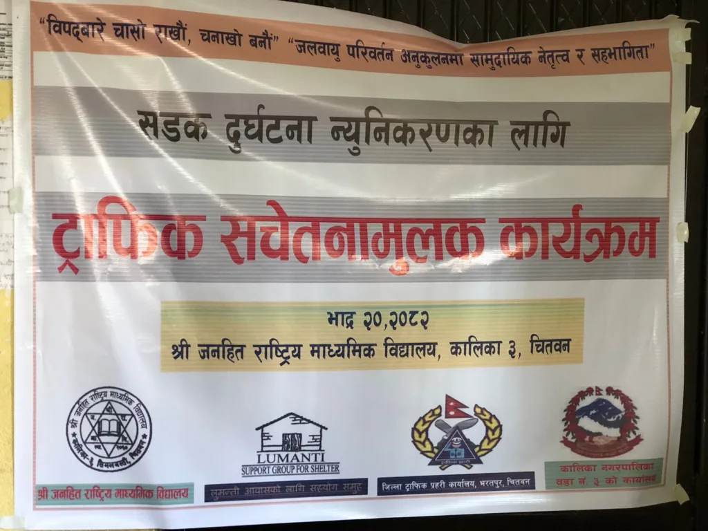 चितवन, कालिका – सडक दुर्घटना न्यूनीकरणका लागि जनहित राष्ट्रिय माध्यमिक विद्यालय, कालिका नगरपालिका वडा नं–३ र लुमन्तीले इलाका प्रहरी कार्यालय टाँडीको सहकार्यमा ट्राफिक सचेतना कार्यक्रम आयोजना गरेको छ।