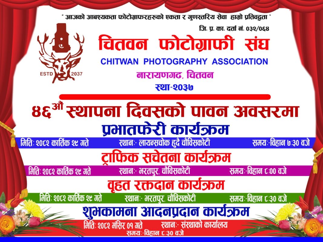 चितवन । चितवन फोटोग्राफी संघले आफ्नो ४६औं स्थापना दिवस भव्य रूपमा मनाउने तयारी गरेको छ। संघले यस अवसरमा भरतपुरको चौविसकोठीमा वृहत रक्तदान कार्यक्रम आयोजना गर्ने भएको छ।