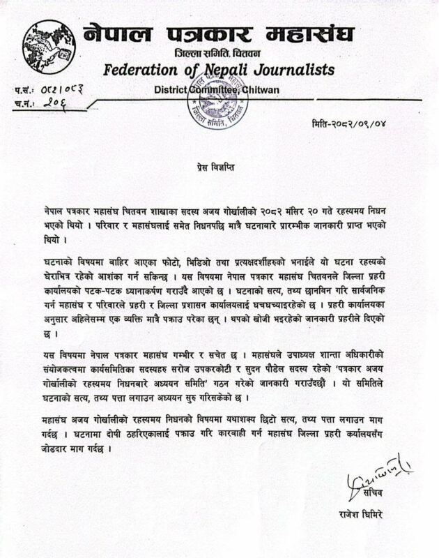 यसैबीच, नेपाल पत्रकार महासंघ चितवन शाखाले पनि यो घटनाप्रति गम्भीर ध्यानाकर्षण जनाएको छ। महासंघका अनुसार पत्रकार अजय गोर्खालीको २०८२ मंसिर २० गते रहस्यमय रूपमा निधन भएको भए पनि परिवार र महासंघले मृत्युपछि मात्रै घटनाबारे प्रारम्भिक जानकारी पाएका थिए। घटनासम्बन्धी बाहिर आएका फोटो, भिडियो तथा प्रत्यक्षदर्शीको भनाइले घटनालाई अझै रहस्यमय बनाएको महासंघको भनाइ छ। घटनाको सत्य–तथ्य छानबिन गरी सार्वजनिक गर्न महासंघले परिवारसँग समन्वय गर्दै जिल्ला प्रहरी कार्यालय चितवन र जिल्ला प्रशासन कार्यालयलाई ध्यानाकर्षण गराइसकेको जनाएको छ।