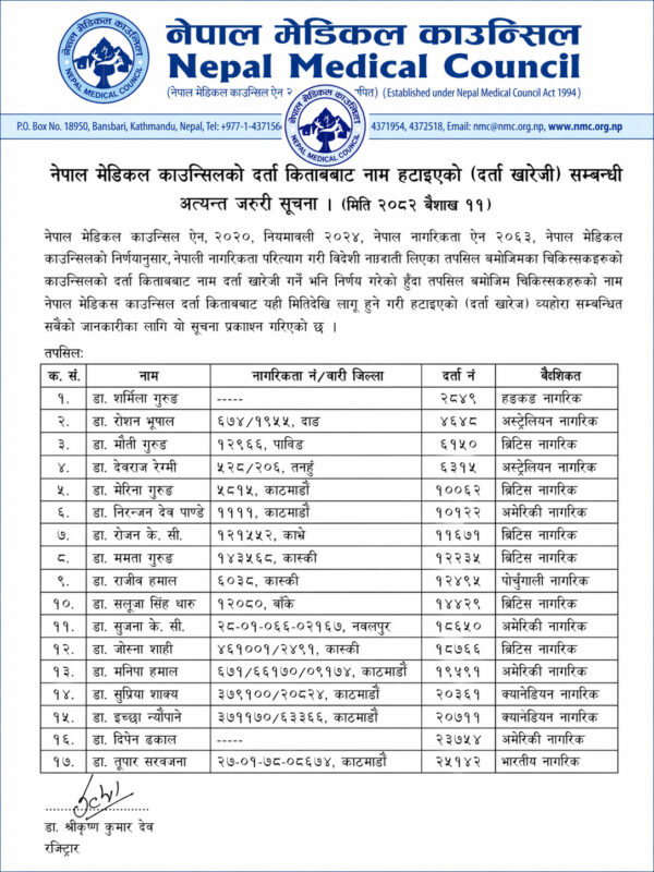 काउन्सिलले शुक्रबार सूचना जारी गर्दै नेपाल मेडिकल काउन्सिल ऐन २०२०, नियमावली २४ तथा नेपाल नागरिकता ऐन २०६३ अनुसार निर्णय गरिएको स्पष्ट पारेको छ।