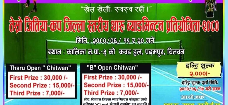 चितवन, १६ असोज थारु महिलाहरुको महान् चाड जितिया पर्वको अवसरमा चितवनमा तेस्रो संस्करणको जिल्ला स्तरीय ‘जितिया कप थारु ब्याडमिन्टन प्रतियोगिता–२०८०’ हुने भएको छ । थारु युथ स्पोर्टस् चितवनको आयोजनामा हुनपुरा पढ्नुहोस्